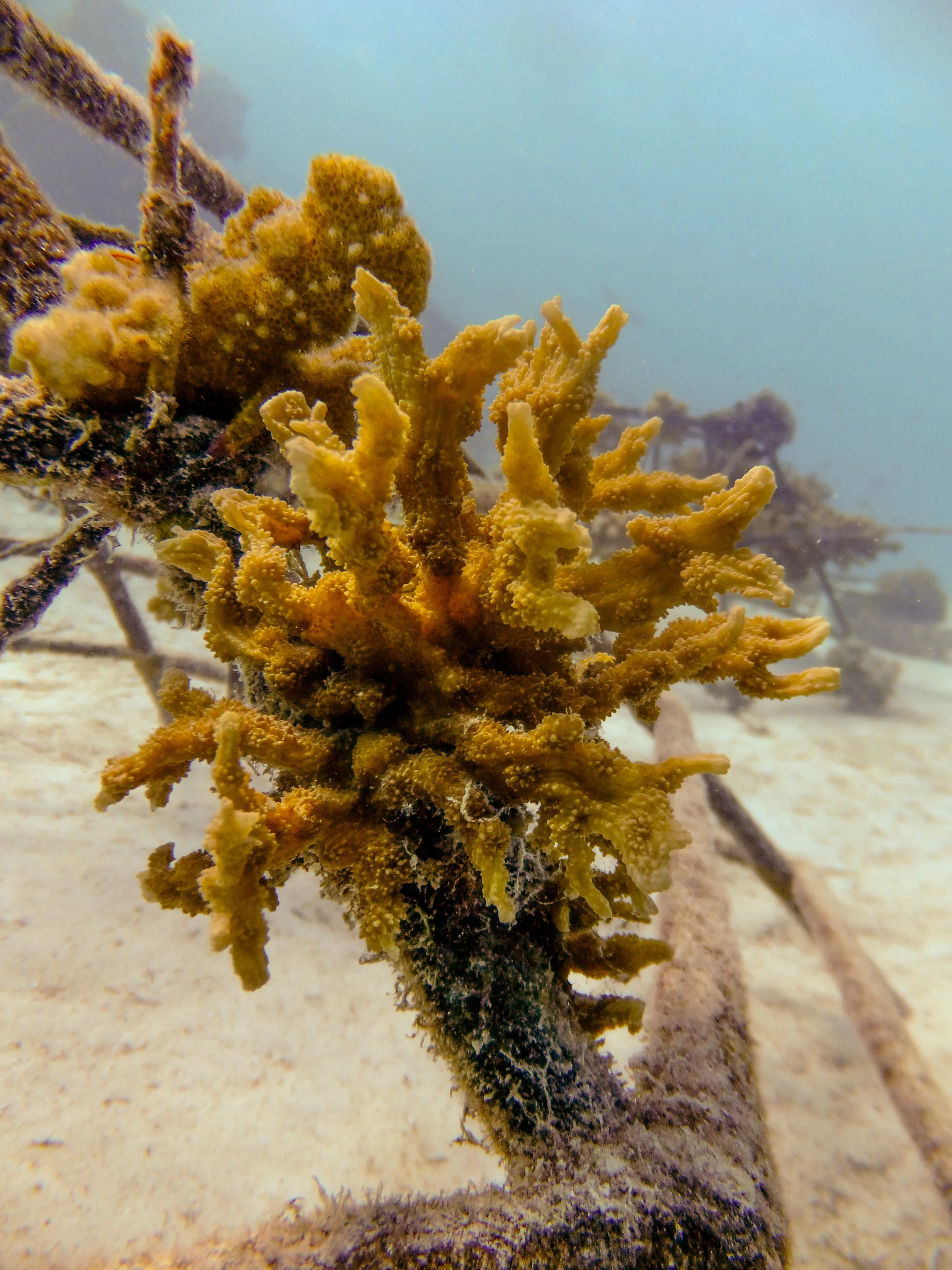 Coral gardening is the process of growing coral polyp to help restore the reef. In our ocean-based nursery we take small fragments of coral (corals of opportunity) which have naturally broken off of the reef and ‘plant’ them in our garden. Once broken from the reef these fragments have a very small chance of survival unless attached to a solid substrate, such as a coral frame or nursery.