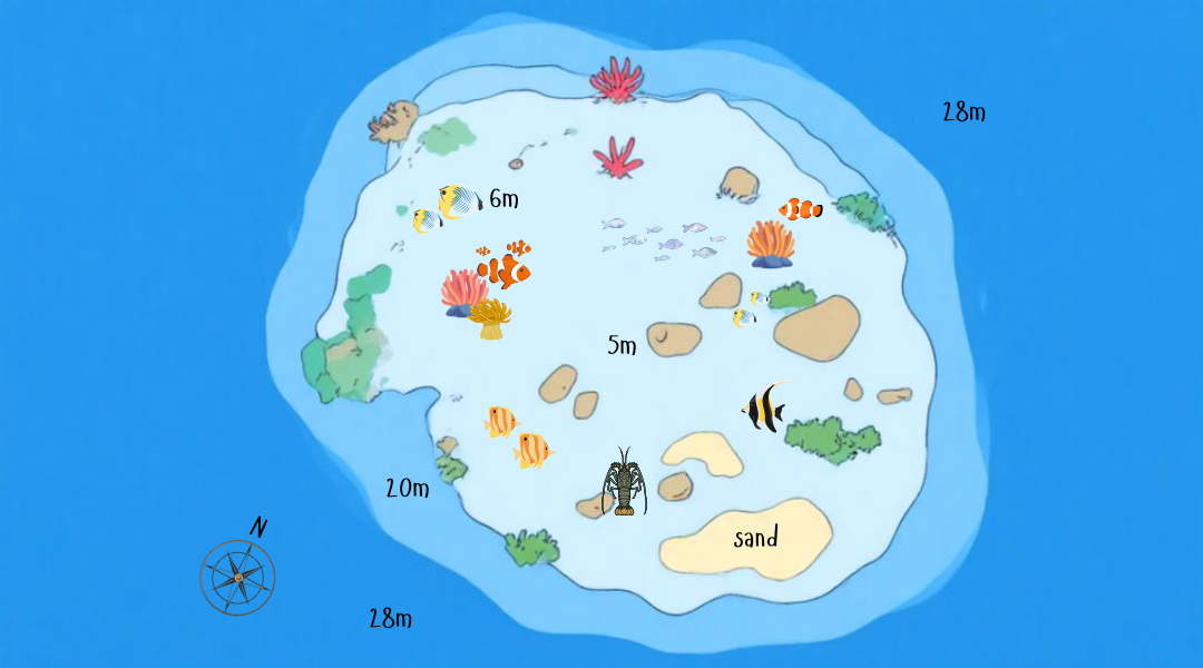 This sheltered and shallow reef drops off at the edge down to a sandy bottom at 25m. A large caves provides shelter to painted rock lobsters and the large coral blocks are surrounded by glass fish and blue stripped snappers. The top of the pinnacle hosts more coral blocks, with schooling colourful reef fish and large anemones.